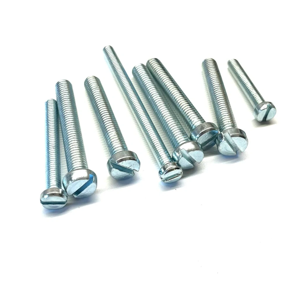 Šrouby jsou s válcovou hlavou, drážkou na plochý šrubovák v povrchové úpravě zinek.